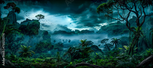 Fototapeta premium panorama view of tropical rainforest at night. Panoramic landscape of green jungle, Tropical rain forest jungle