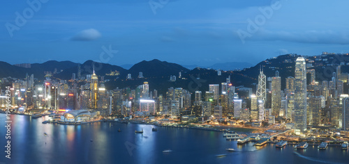 © leeyiutung, Fototapeta premium Panorama view of Victoria Harbor of Hong Kong city at dusk
