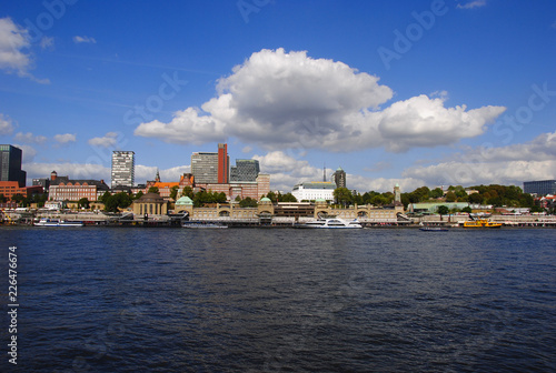 © Kai, Naklejka premium panorama view on the Landungsbrücken in Hamburg in Germany