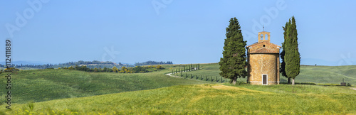 Fototapeta premium panorama with lonely chapel and cypress trees in Tuscany in Italy