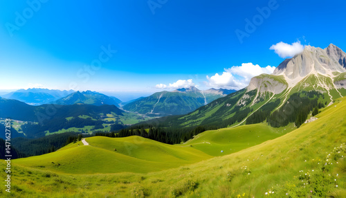 © Orty Images, Fototapeta premium Panoramablick auf die Bayerischen Alpen mit grünen Wiesen