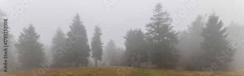 Obraz premium Panoramafoto der nebligen Herbststimmung mit Bäumen eines Nadelwaldes am Morgen auf dem menschenleeren Gipfelplateau des Großen Feldbergs im Taunus