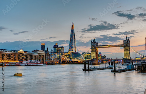 Fototapeta premium Panoramę Londynu z Tower Bridge i Shard po zachodzie słońca