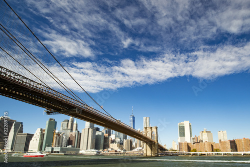 © Travel Wild, Fototapeta premium Panoramę Manhattanu z mostem Brooklyn i One World Trade Center w tle w słoneczny dzień w Nowym Jorku, USA.