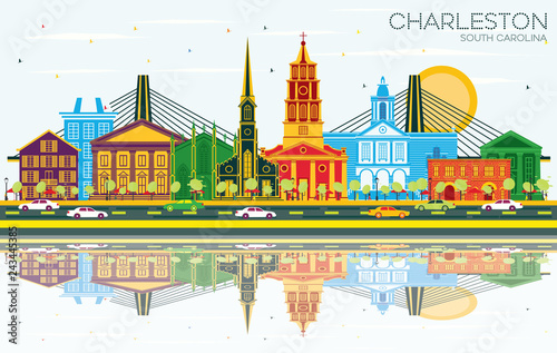 © BooblGum, Fototapeta premium Panoramę miasta Charleston w Południowej Karolinie z kolorowymi budynkami, błękitnym niebem i odbiciami.