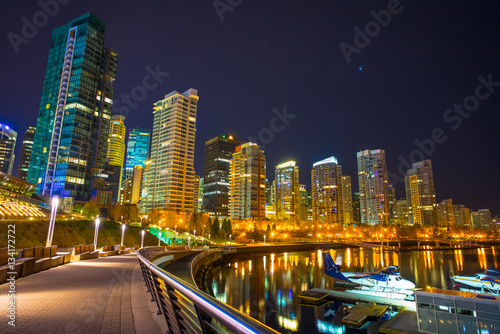 © Lynn Yeh, Fototapeta premium Panoramę miasta Vancouver w Kanadzie w nocy. Wodnosamolot zaparkowany w porcie w Vancouver.