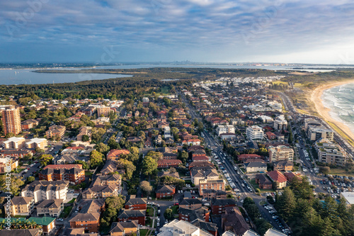 © Steve, Fototapeta premium Panoramic aerial drone view of Cronulla in the Sutherland Shire, South Sydney, looking toward North Cronulla Beach during summer in the early morning