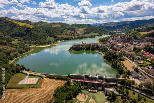 Naklejka premium Panoramic aerial drone view of the medieval village of Sassocorvaro above the Mercatale dam, in the province of Pesaro Urbino, Marche, Italy. The village exudes peace, serenity, and ancient history.