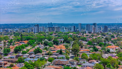 © Elias Bitar, Fototapeta premium Panoramic aerial drone view of western Sydney Suburbs of Canterbury Burwood Ashfield Marrickville Campsie with Houses roads and parks in Sydney New South Wales NSW Australia