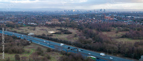 Fototapeta premium Panoramic aerial image of M60 Manchester outer ring road near Swinton with Manchester skyline on the horizon.