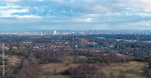 © bardhok, Obraz premium Panoramic aerial image of Manchester Skyline from Swinton area.