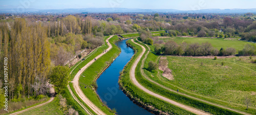 © bardhok, Fototapeta premium Panoramic Aerial Image of River Mersey in Trafford, Greater Manchester.