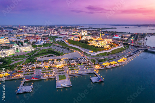 © Parilov, Fototapeta premium Panoramic aerial top view of Kazan Kremlin Kul Sharif mosque islam republic sunset, Tatarstan Russia