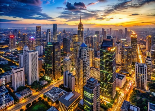 Obraz premium Panoramic aerial view of a bustling metropolis at dusk, with towering...