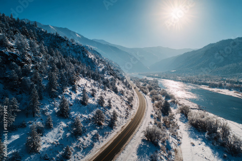 © KseniaJoyg, Fototapeta premium Panoramic aerial view of a snowy winter landscape with a road and a river