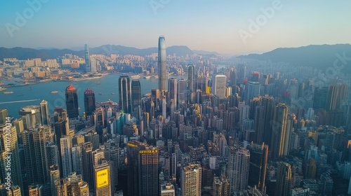 © suryono, Fototapeta premium Panoramic aerial view of a vibrant city skyline at sunrise, featuring numerous skyscrapers, buildings, and a harbor.