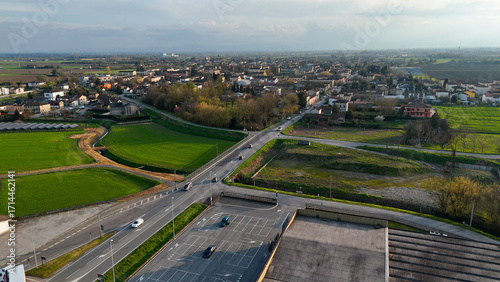 © august.columbo, Fototapeta premium Panoramic aerial view of Castelvetro Piacentino and surrounding countryside with SS 10 highway and agricultural fields in the Piacenza region of Italy captured on a clear day