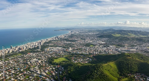© Adobe, Fototapeta premium Panoramic aerial view of coastal city, showing a blend of urban development and natural landscape, including ocean, beach, and mountains under a partly cloudy sky