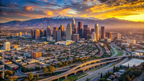 © Sirinporn, Fototapeta premium Panoramic aerial view of Los Angeles cityscape at sunset, showcasing towering skyscrapers, bustling freeways, and majestic mountain ranges in a warm, golden light.