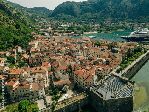 Naklejka premium Panoramic aerial view of Perast small town along the Kotor Bay, Montenegro.