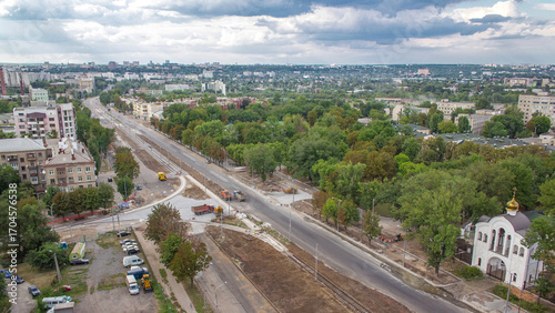 © HyperlapsePro, Fototapeta premium Panoramic aerial view of road big construction site timelapse