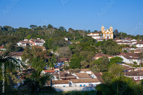 © wtondossantos, Obraz premium Panoramic aerial view of the city of Tiradentes with colorful sky at sunset, Minas Gerais.