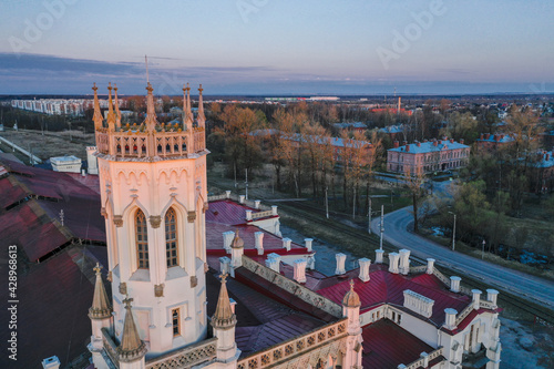 © AndreyZayats, Fototapeta premium Panoramic aerial view of the New Peterhof railway station in the Pseudo-Gothic style. The western facade of the building is in the form of a four-tiered tower. Russia, Peterhof, 20.10.2020.