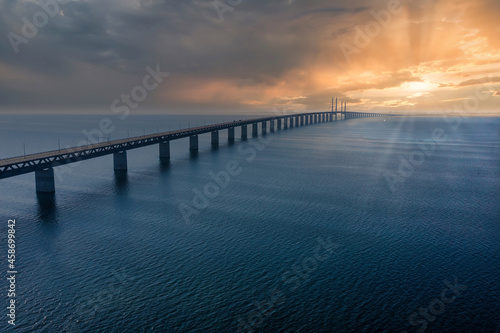 Fototapeta premium Panoramic aerial view of the Oresundsbron bridge between Denmark and Sweden, at sunset. Oresund Bridge close up view from above