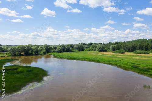 Fototapeta premium Panoramic aerial view of the Volkhov River near Veliky Novgorod, natural...
