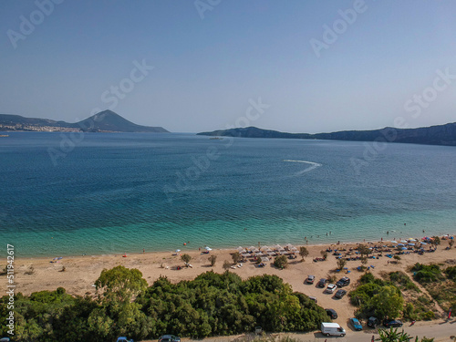 © panosk18, Fototapeta premium Panoramic aerial view over Divari beach near Navarino bay, Gialova. It is one of the best beaches in mediterranean Europe. Beautiful lagoon near Voidokilia from a high point of view, Messinia, Greece