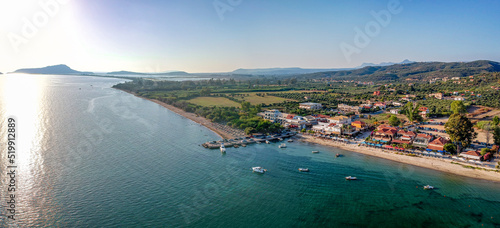 Naklejka premium Panoramic aerial view over Gialova seaside city in Navarino bay. It is one of...