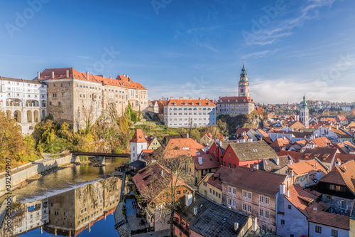 Naklejka premium Panoramic aerial view over towncenter of Cesky Krumlov during autumn season in Czech Republic