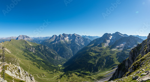 © Julia, Fototapeta premium Panoramic alpine valley view, lush green valleys, and snow-capped mountain peaks under a clear blue sky.