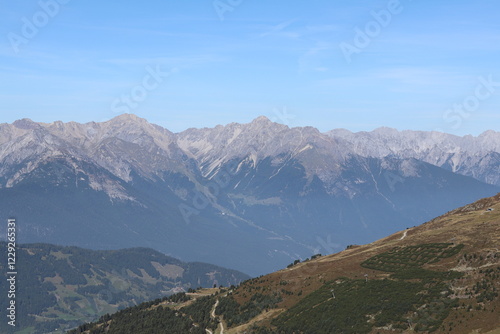 © Liza, Fototapeta premium Panoramic Alpine Valley with Mountain Ranges