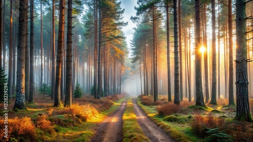 © Four888, Fototapeta premium Panoramic Autumn Pine Forest Path, Foggy Evening Landscape