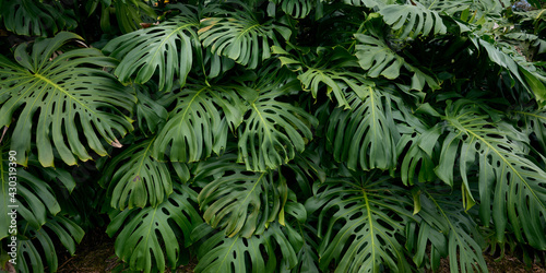 Fototapeta premium Panoramic background with green tropical leaves Monstera in Hawaii.