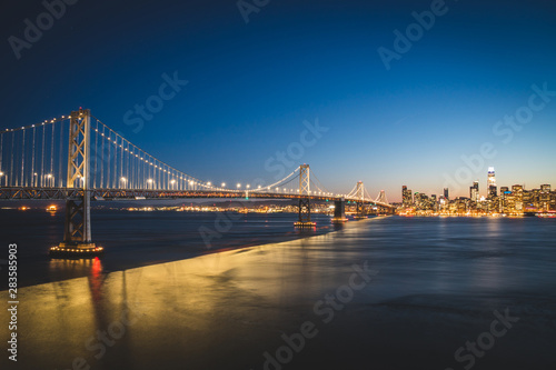 Obraz premium Panoramic beautiful scenic view of the Oakland Bay Bridge and the San Francisco city in the evening, California