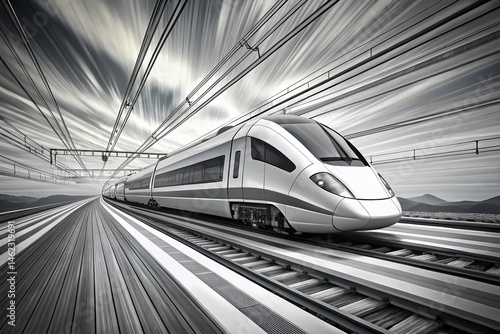 © Danicha, Fototapeta premium Panoramic Black and White Line Art: Modern High-Speed Train on Tracks