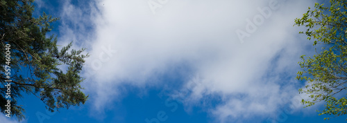 © daphnusia, Obraz premium Panoramic blue cloudy sky background behind tree branches. High resolution.