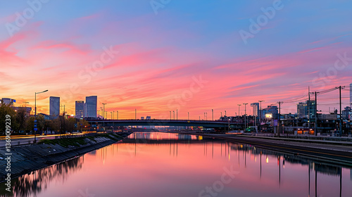 © predator, Fototapeta premium Panoramic City River Sunset View
