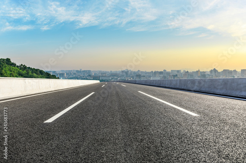 © ABCDstock, Fototapeta premium Panoramic city skyline and buildings with empty asphalt road at sunrise