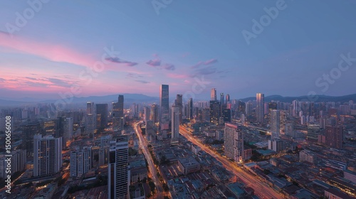 © K4VEE, Fototapeta premium Panoramic city skyline at dusk featuring modern skyscrapers against blue evening sky. Urban landscape captures twilight atmosphere with bustling streets below
