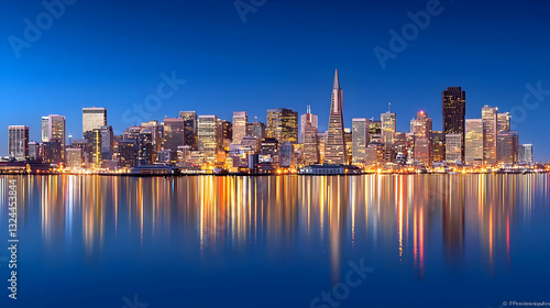 © julio, Naklejka premium Panoramic City Skyline At Night With Illuminated Buildings Reflected In Tranquil Water Under A Blue Sky