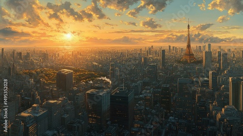 © arief, Fototapeta premium Panoramic city skyline at sunrise with a blend of architectural styles.
