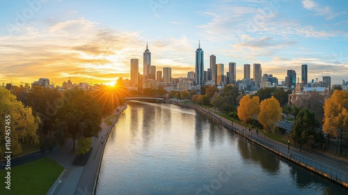 © Fauzerene, Obraz premium Panoramic City Skyline at Sunset