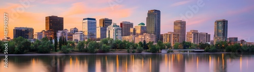 © Berkah, Naklejka premium Panoramic city skyline at sunset over tranquil water.