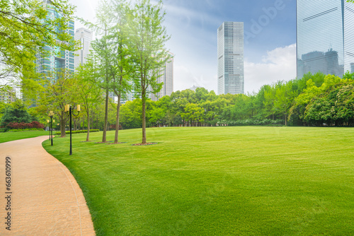 Obraz premium Panoramic city skyline with green lawn in Shanghai