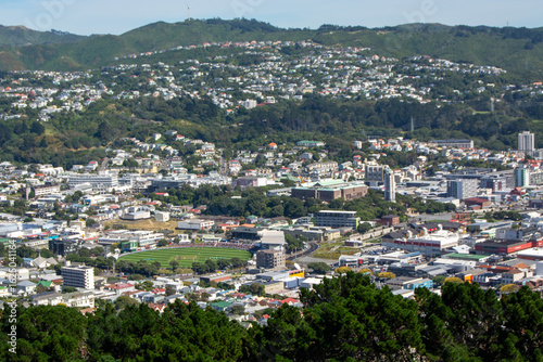 © josh.rnz, Naklejka premium Panoramic City View in a Hilly Landscape