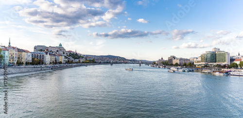 © AVPHOTOSALES, Naklejka premium Panoramic city view of both sides of river Danube in Budapest, Hungary. Wide cityscape of Buda and Pest sides with Chain Bridge across the Danube.