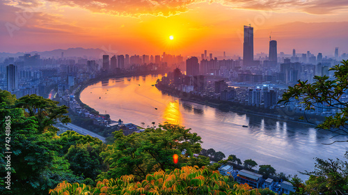 © Jahid, Fototapeta premium Panoramic cityscape at sunset, showcasing the urban skyline and architectural landmarks in a vibrant, atmospheric setting